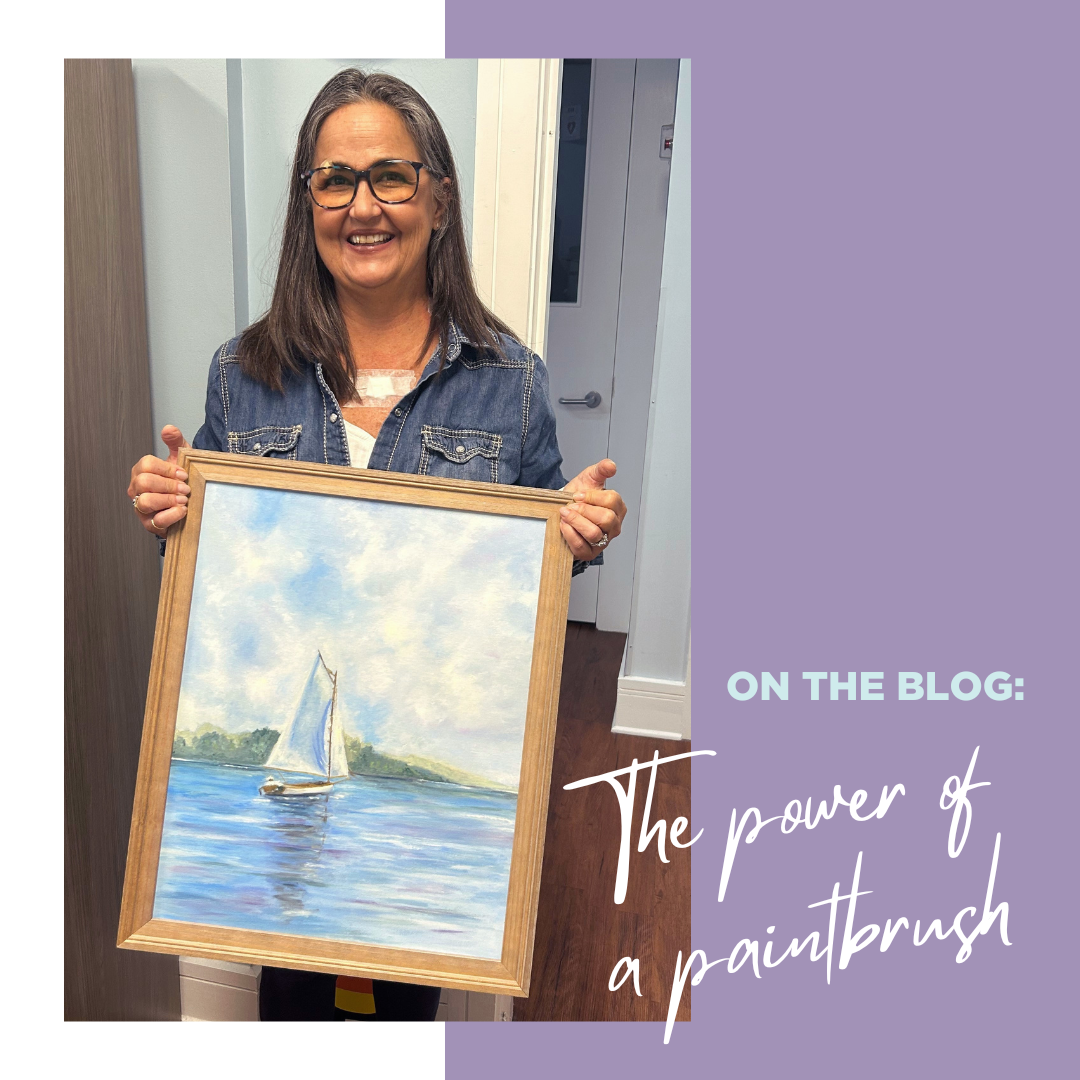 Jeff got involved with Caring House years ago after being invited to one of our annual galas. He toured our home and was inspired by our mission, joining the board in 2019. Now, he not only gives his time and support to our organization, but also his creative work. “I try to deliver paintings that are colorful and thoughtful, with the hope they will warm the living spaces for our guests,” he said. Ranging from towering forests and pink skies, to rolling hills and boats on the water, Jeff’s paintings often feature picturesque landscapes with brushstrokes in cool tones.